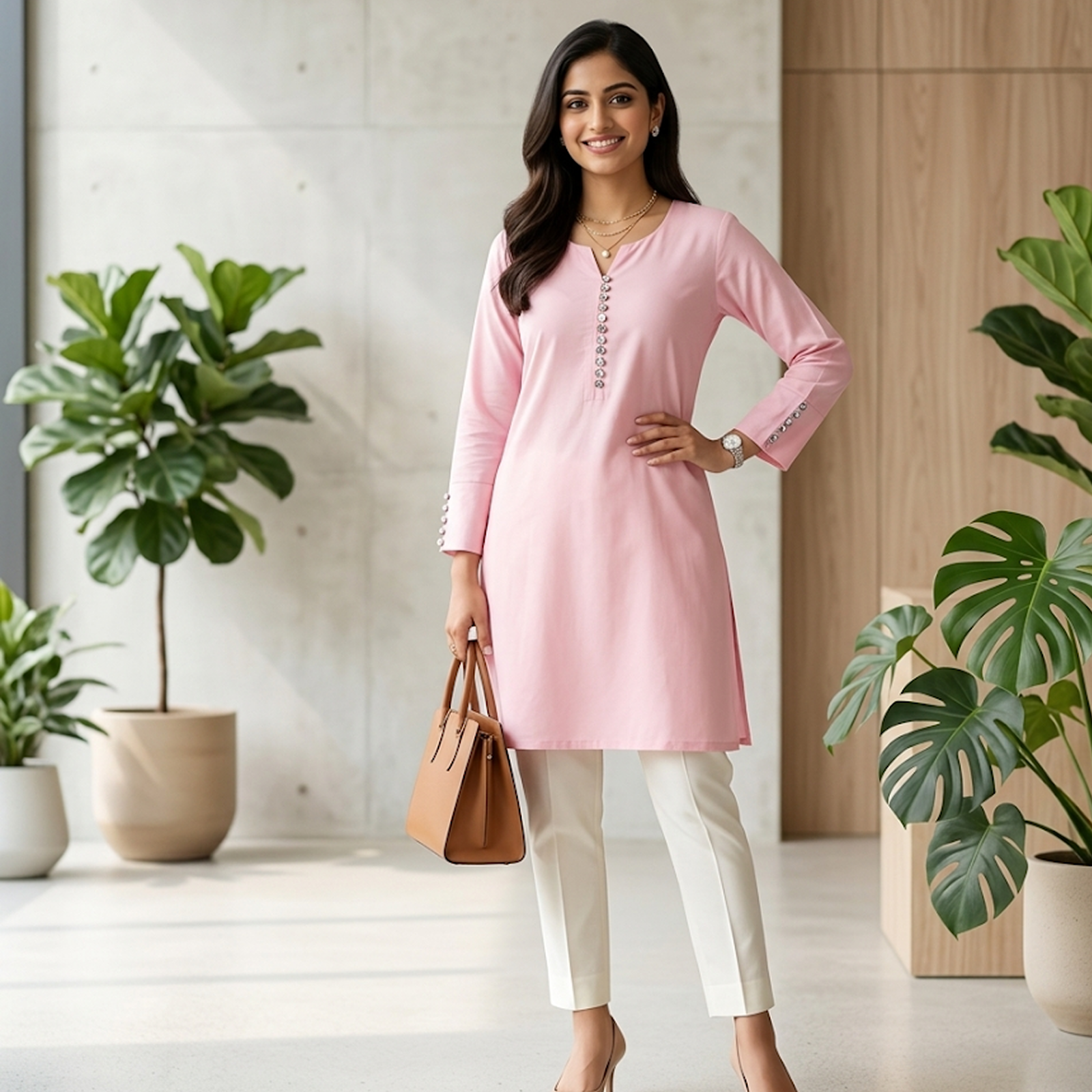 Upgrade your daily wear with this charming light pink short kurti. Crafted from breathable, ultra-soft hozari cotton, it perfectly balances elegance with everyday comfort. Featuring a classic split neckline with decorative buttons and elegant button-detailed sleeves, this versatile tunic is perfect for any casual or office occasion.