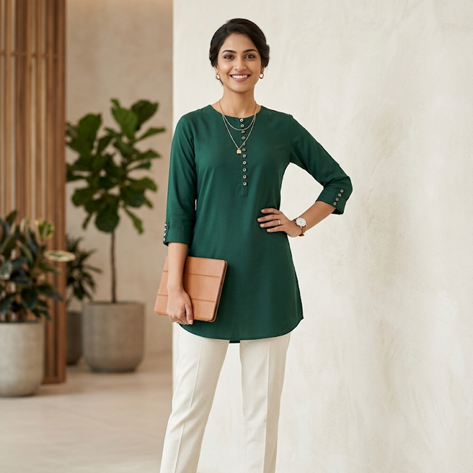 Step into effortless elegance with this deep green short kurti. Tailored from premium hozari cotton, it ensures unmatched breathability and comfort. Featuring a sleek front button placket and a polished curved hem, this versatile tunic seamlessly transitions from professional settings to casual outings.