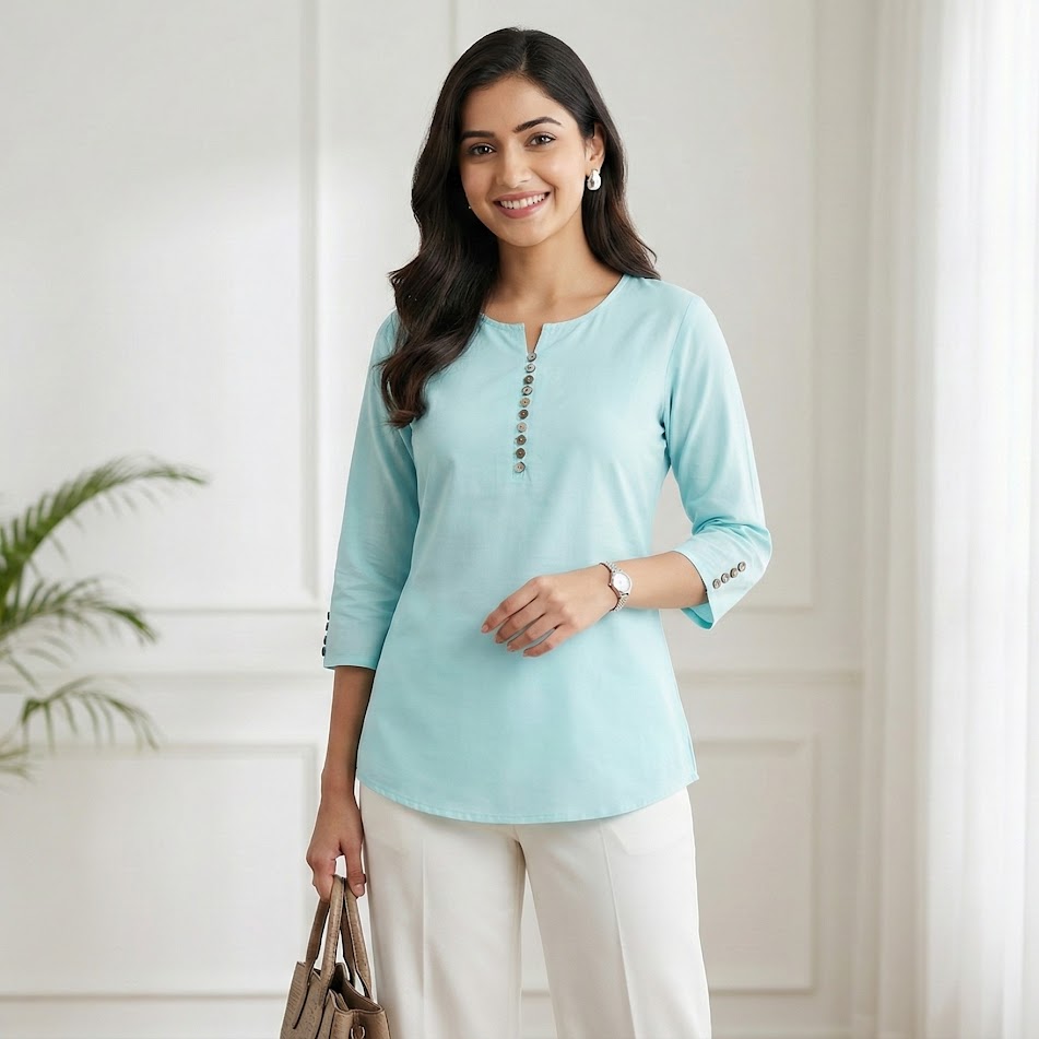 Upgrade your wardrobe with this soothing light blue short top. Crafted from breathable, ultra-soft hozari cotton, it ensures all-day comfort and effortless style. Featuring a flattering split neckline with metallic buttons and a graceful curved hem, this versatile top seamlessly transitions from office wear to casual outings.