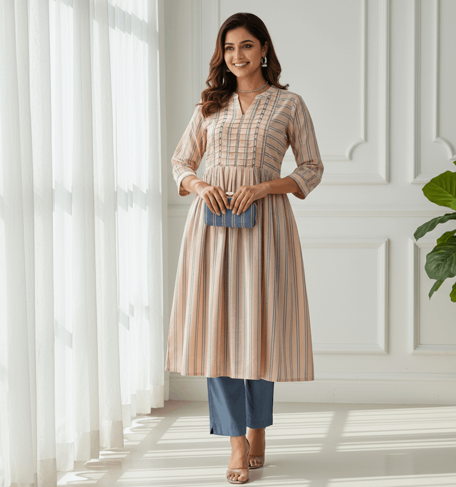 Step into effortless elegance with our beautiful peach and blue striped cotton anarkali. Perfectly crafted for the modern woman this graceful piece combines classic silhouettes with contemporary patterns making it a wonderful addition to your daily wardrobe. The soft peach base is beautifully adorned with sophisticated vertical blue stripes that create a highly flattering elongating effect.