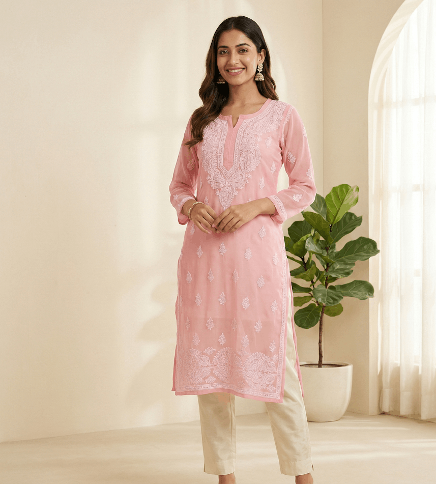 Step into timeless elegance with this beautiful pastel pink georgette kurti. Crafted from delicate flowy georgette fabric this stunning piece offers a graceful silhouette perfect for festive gatherings or elegant daytime events. The sheer beauty of the lightweight outer layer is perfectly complemented by a soft matching inner lining ensuring you stay comfortable and confident all day long.