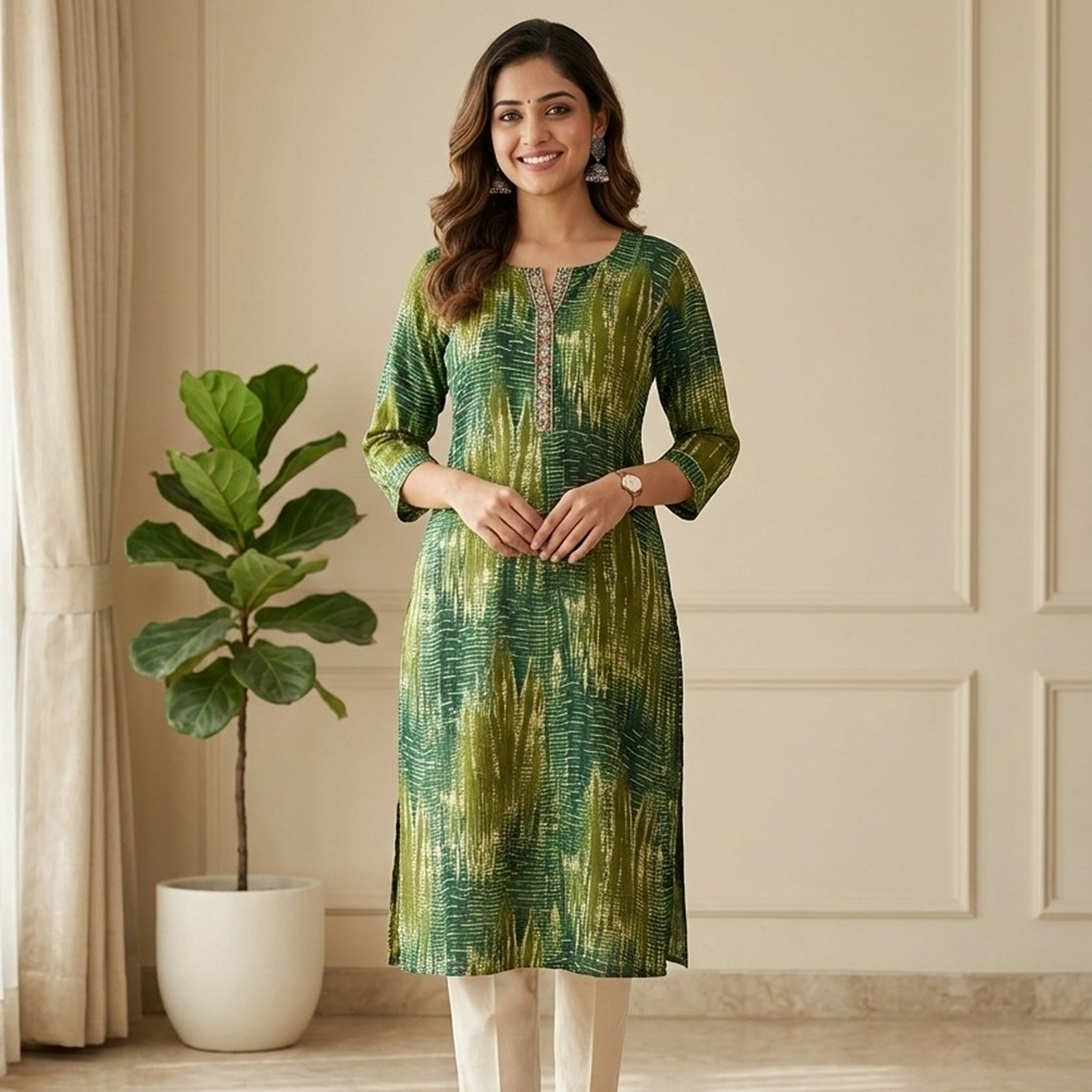 Embrace effortless elegance with this vibrant green rayon kurti. Featuring a contemporary abstract print, it provides a silky drape and all-day comfort, making it perfect for both professional environments and relaxed social events.