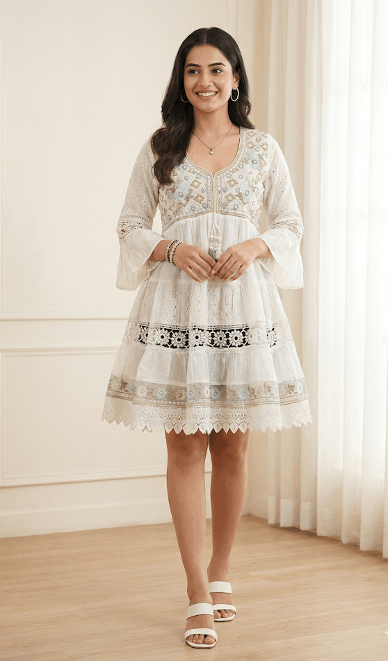 Embrace the effortless beauty of summer days with our stunning white embroidered cotton frock. Designed perfectly for the modern woman who appreciates fine craftsmanship and breezy silhouettes this exquisite mini dress brings a wonderful touch of bohemian elegance to your seasonal collection. The pristine ivory white fabric serves as a beautifully fresh canvas highlighting the rich textures and delicate artistry woven throughout the entire garment.