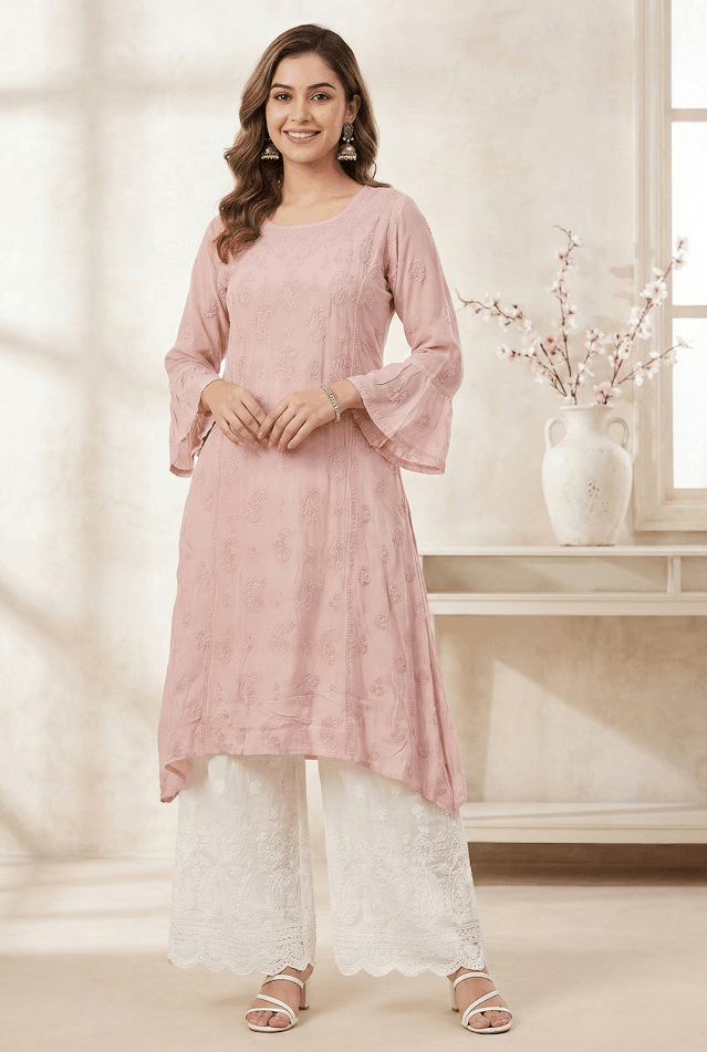 Crafted from luxurious pure viscose this kurti promises a soft breathable feel that drapes beautifully across your silhouette. The delicate blush pink hue serves as a wonderful canvas for the intricate chikankari embroidery. Rich traditional motifs including classic paisley and floral patterns are carefully woven throughout the fabric showcasing exquisite artisanal skill and attention to detail.